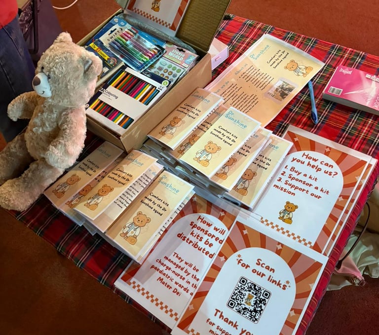 Dr Sunshine Comfort Kits are lovingly curated with one goal: to bring Comfort, Hope, and Warmth to children during their hospital stay. Each box is filled with thoughtfully chosen items - a soft blanket, creative supplies, a playful game, and even an original Dr Sunshine storybook - designed to brighten the day of a young patient who needs a lift.