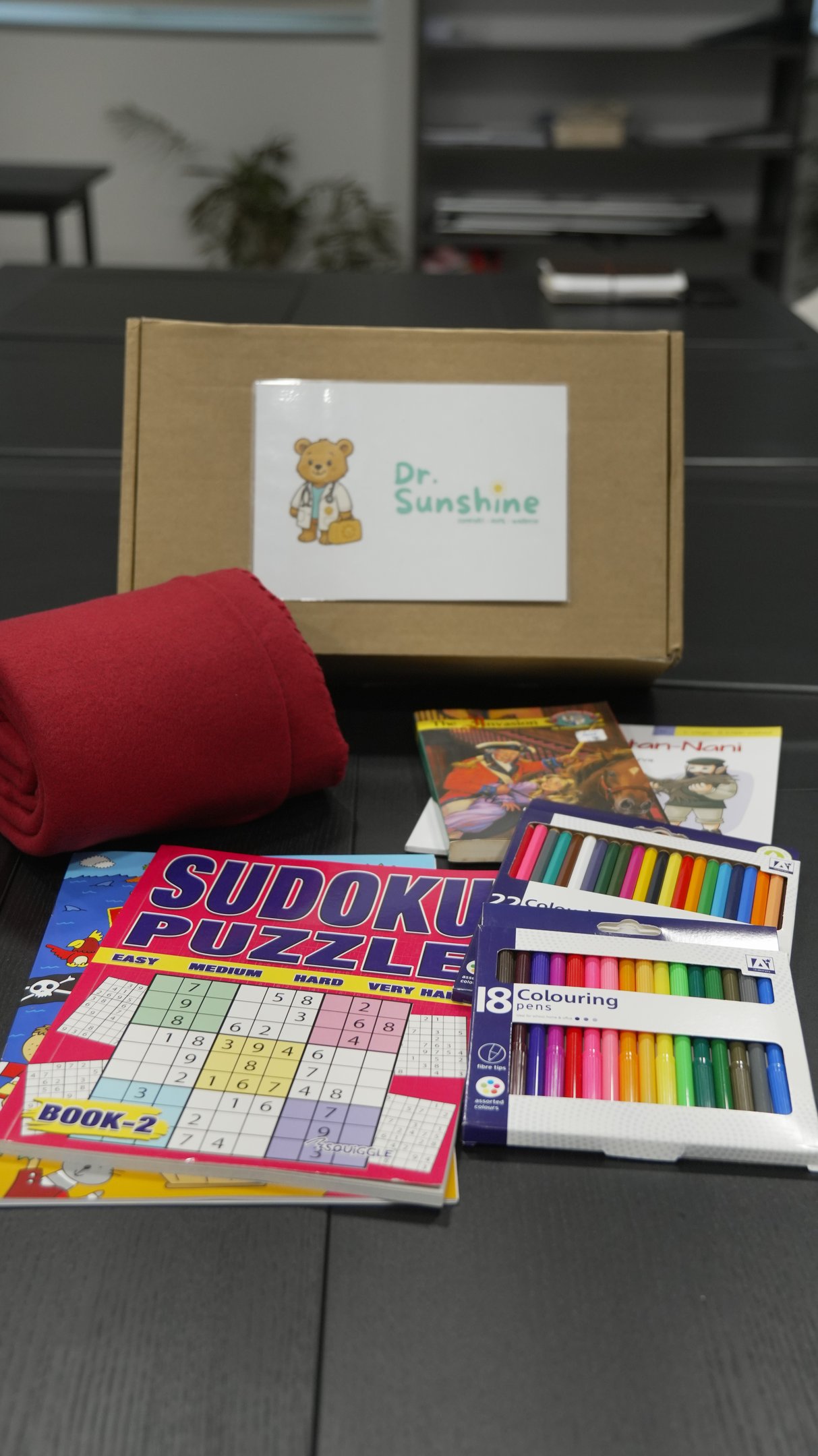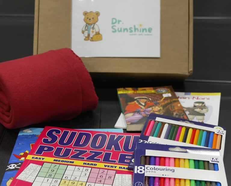 Dr Sunshine's first Comfort Kit is a carefully designed care package created to brighten the hospital experience for children. Each kit includes a soft fleece blanket, storybooks, activity and puzzle books and colouring materials - items chosen to provide comfort, reduce anxiety and keep children engaged during long hours away from home.